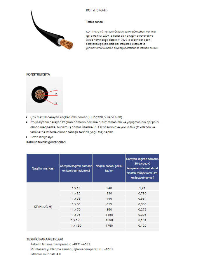 İstifadə yeri - КОГ (H07G-H) markalı yüksək elastikli güc kabeli, nominal işçi gərginliyi 220V - a qədər olan dəyişən cərəyanda və yaxud nominal işçi gərginliyi 700V- a qədər olan sabit cərəyanda işləyən, qaldırıcı kranlarda, avtomat və yarımavtomat elektrod qaynaq aparatlarında istifadə olunur