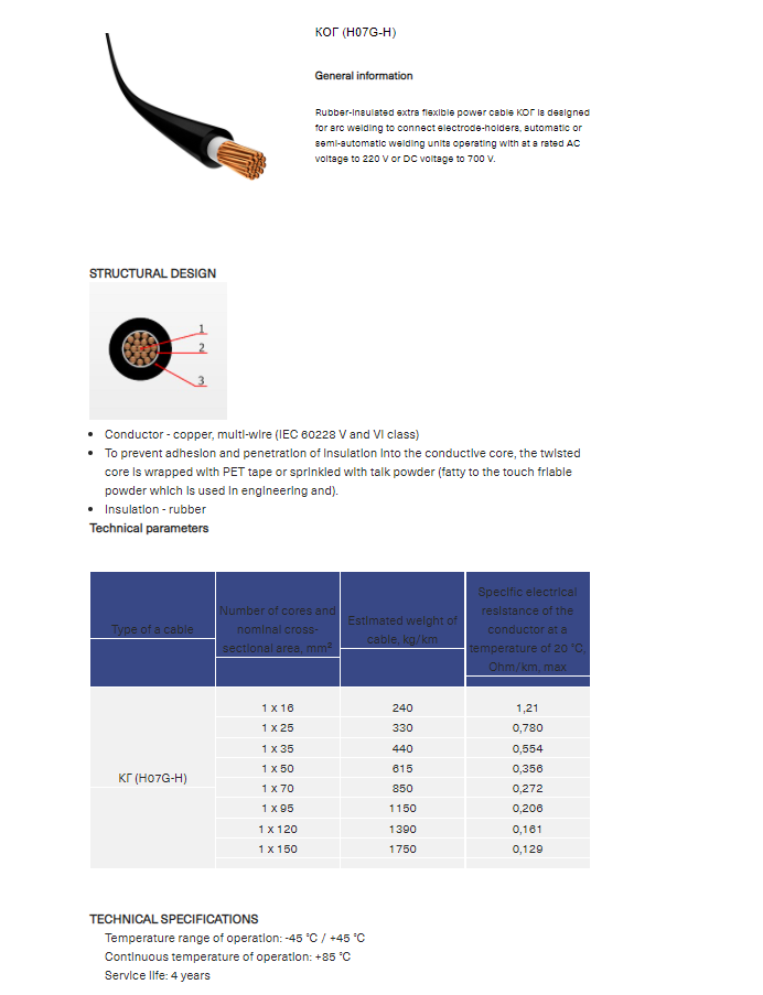 Place of use - Rubber-insulated extra flexible power cable КОГ is designed for arc welding to connect electrode-holders, automatic or semi-automatic welding units operating with at a rated AC voltage to 220 V or DC voltage to 700 V